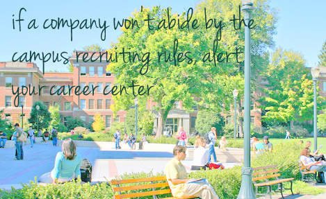 Hopefully you won’t encounter this in your own campus recruiting process, but if you do your career center will be on your side so you may want to go to them and alert them to what’s happening and get advice. If it is happening to you, they are 100% doing the same thing to others as well. Ultimately, the campus recruiting “school rules” are in place to help you not be in an uncomfortable situation and do what’s best for the students. Help them do this and ultimately, it will help you!