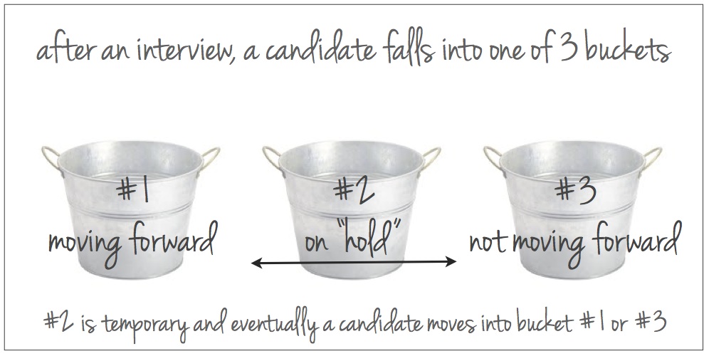 Your goal in following up is to find out which bucket you are in so you’re not just hanging out there. If you give the company about 1.5 weeks, they should have a good indication of where you are. If you are definitely moving forward or definitely not getting the job, they should be able to tell you that at this point in time. If you are in the “hold” bucket, that’s where the process starts to drag.