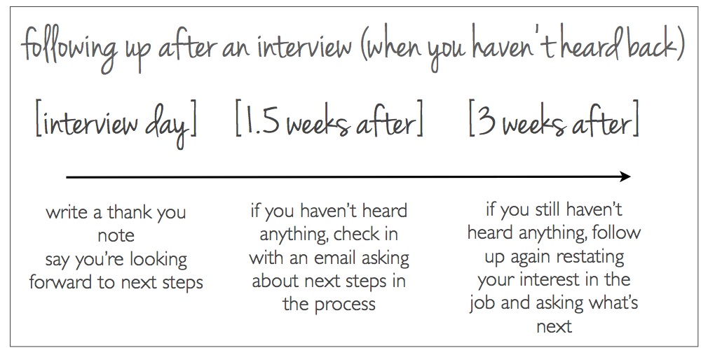 The first step in following up is writing a thank you note the day of the interview or the day after the interview. Thank those who interviewed you and also the person who set up the interview or is coordinating the process. If you don’t hear back after your thank you, don’t worry – this is NOT bad sign. It actually doesn’t mean anything so don’t read into it.